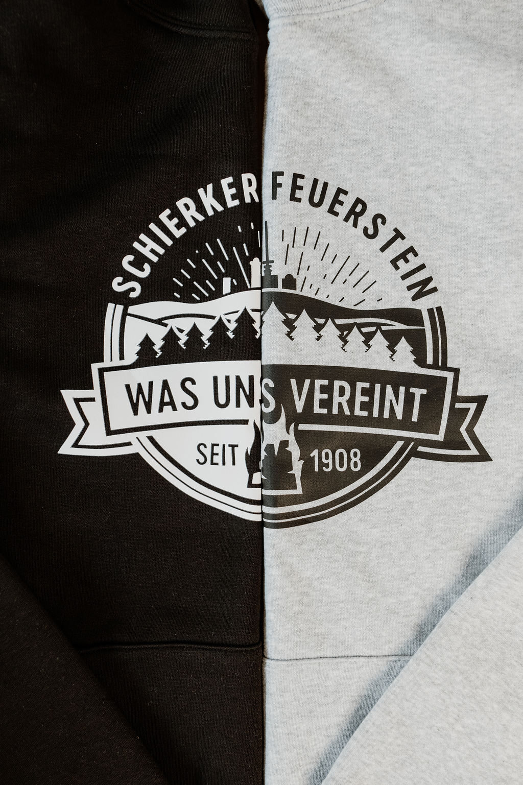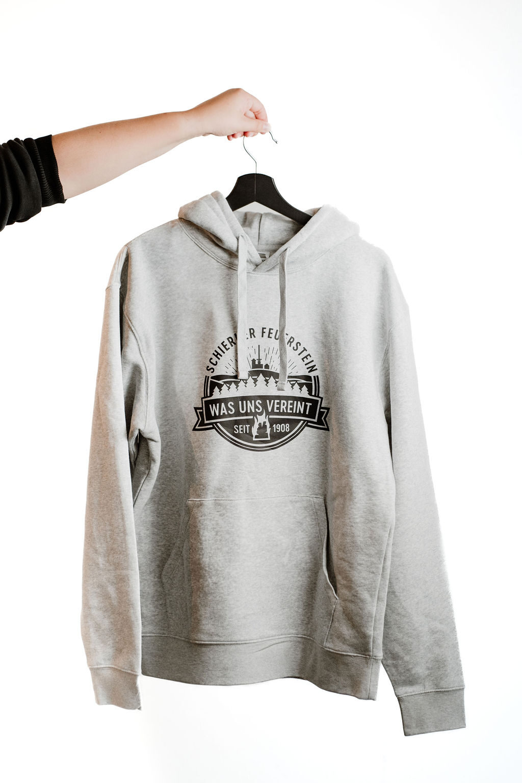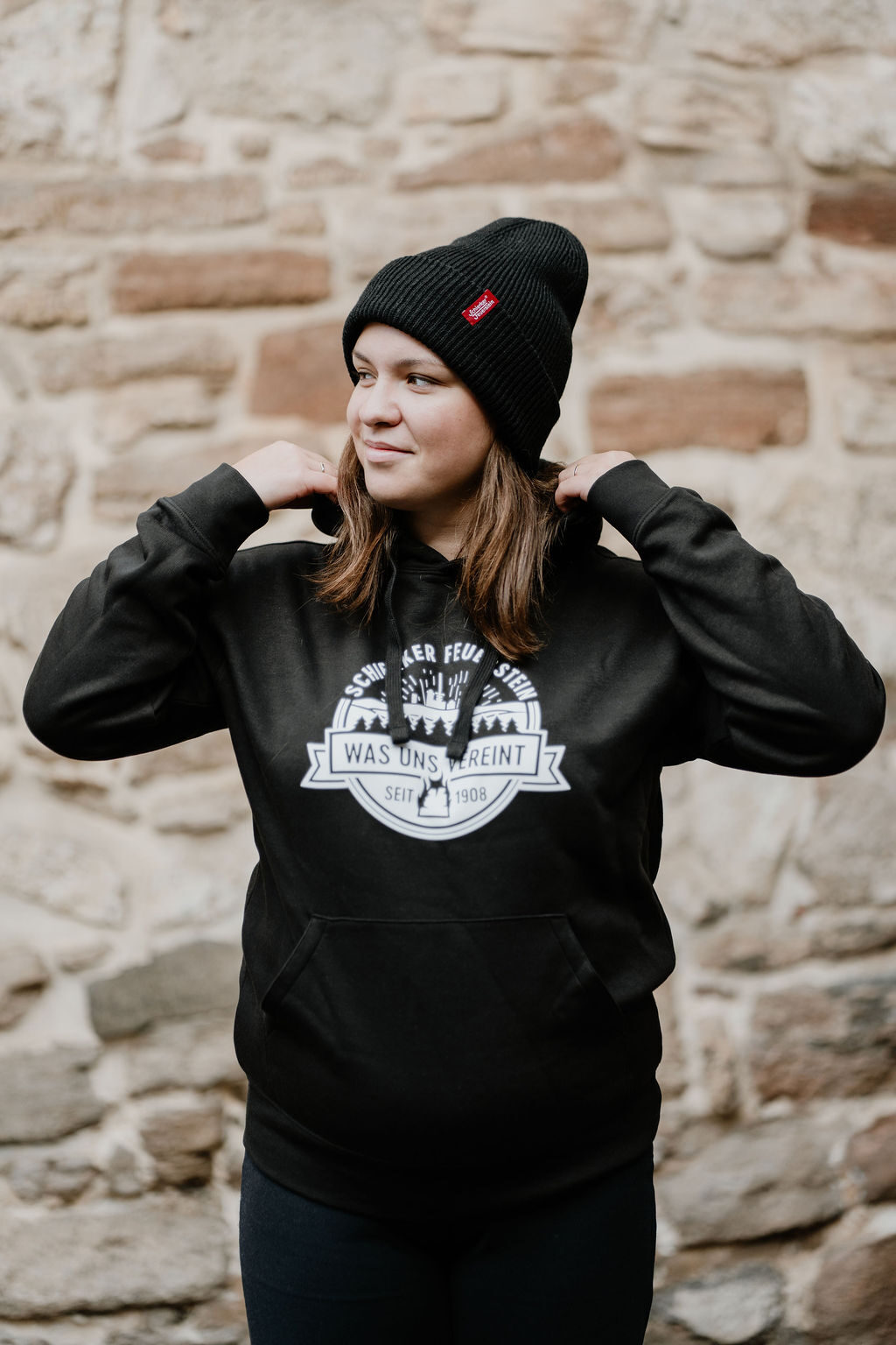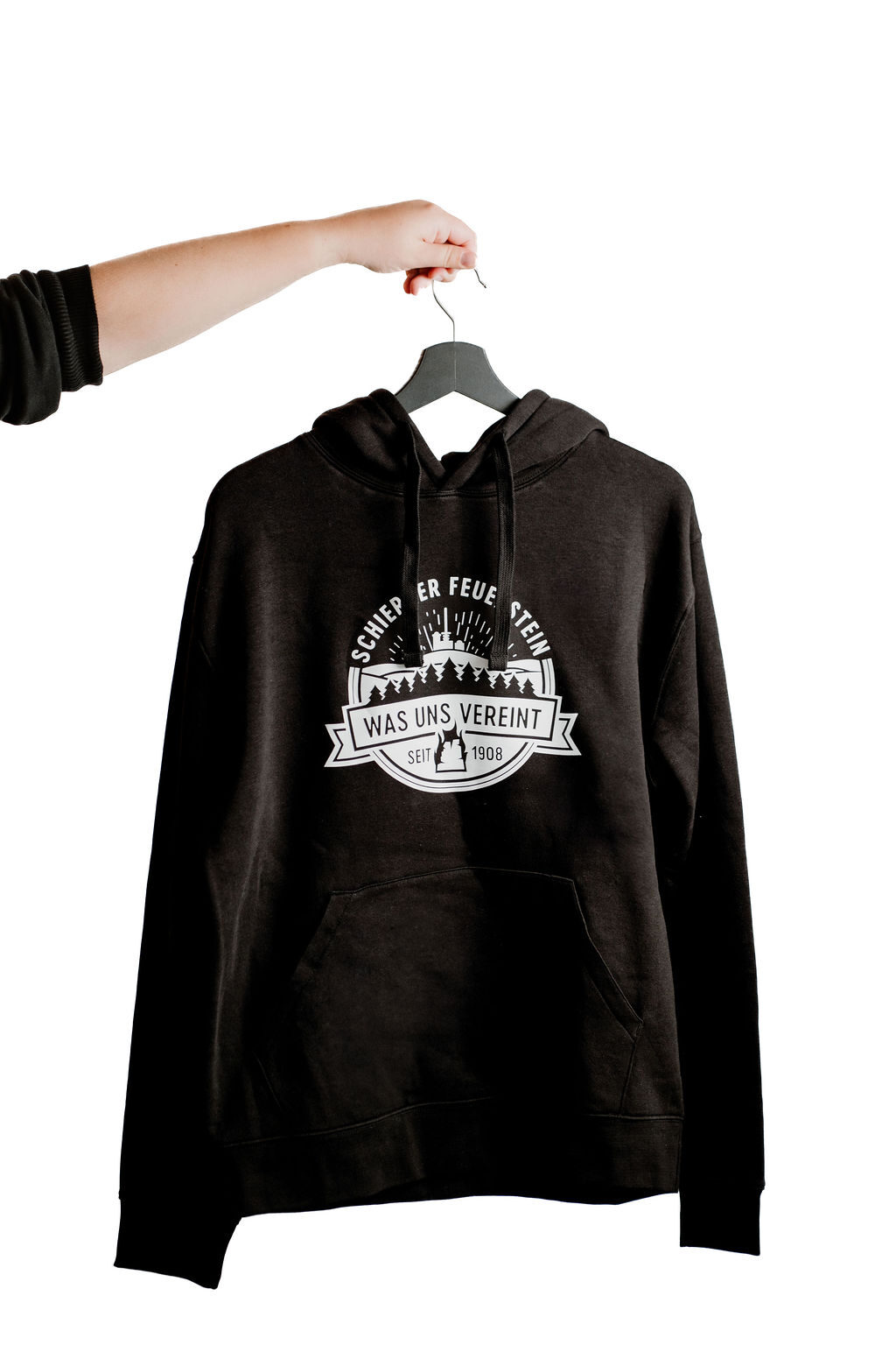 Unisex Hoodie mit Kapuze und Kängurueingriffstasche mit dem ikonischen WAS UNS VEREINT-Emblem.